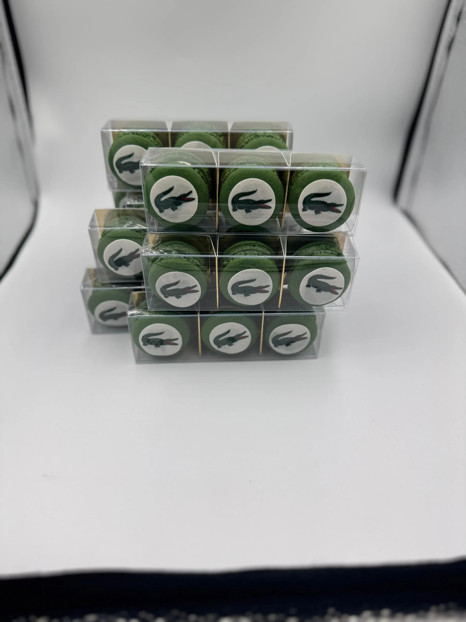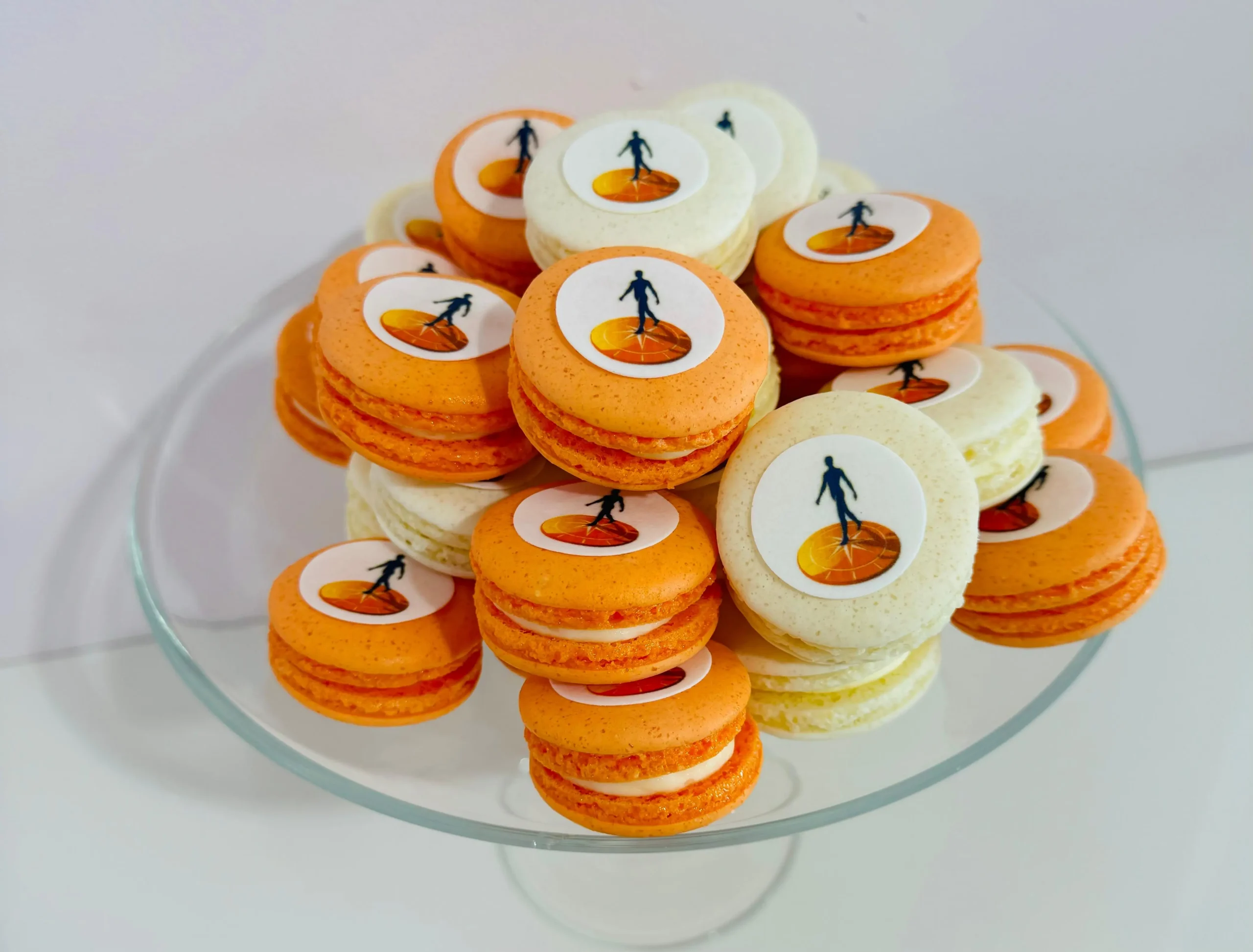 Wil je een iets luxere uitstraling? Dan zijn onze macarons met logo een prachtige keuze. Deze verfijnde Franse lekkernijen zijn kleurrijk, stijlvol en geven elk merk een elegante uitstraling. We maken onze macarons elke dag vers met amandelmeel en romige vullingen. Jouw logo drukken we op eetbaar papier dat we met zorg aanbrengen, zodat het er perfect uitziet zonder dat het ten koste gaat van de smaak.